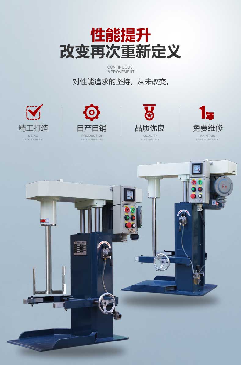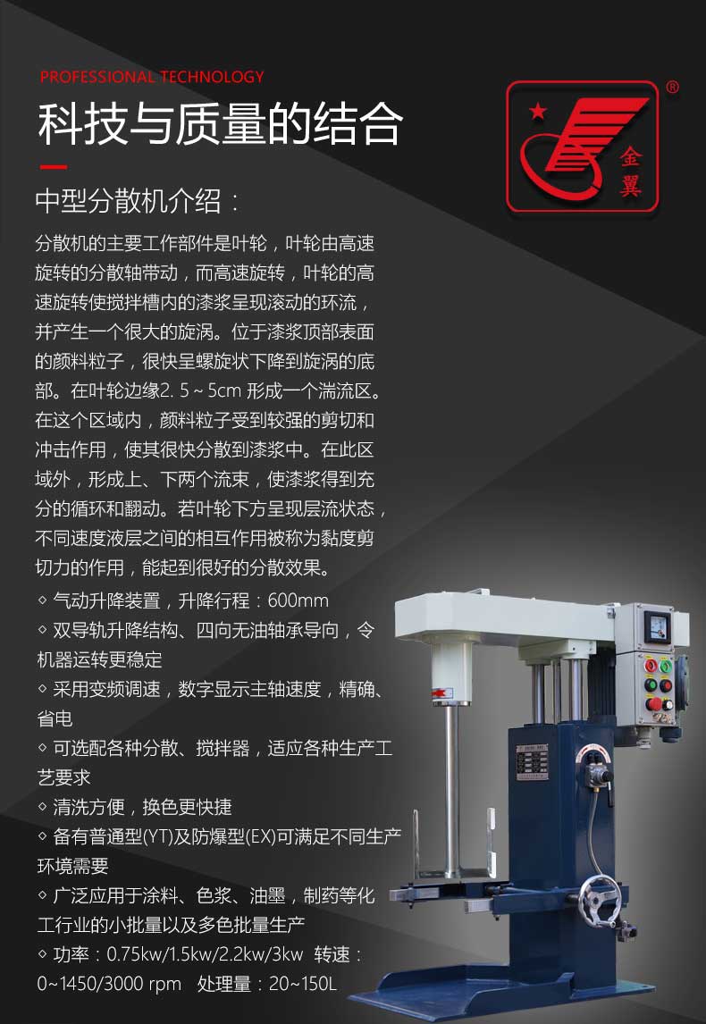 產(chǎn)品特點:1、轉速快而穩(wěn)定,分散、混合效果好; 2、可選配各種分散、攪拌葉輪以及定制防爆性能; 3、轉速數(shù)字顯示,便于記錄數(shù)據(jù); 4、可選配帶夾套的容器; 5、氣動升降裝置,升降行程:600mm; 6、雙導軌升降結構、四向無油軸承導向,令機器運轉更穩(wěn)定 ; 7、采用變頻調速,數(shù)字顯示主軸速度,精確、省電; 8、 可選配各種分散、攪拌器,適應各種生產(chǎn)工藝要求; 9、 清洗方便,換色更快捷; 10、備有普通型(YT)及防爆型(EX)可滿足不同生產(chǎn)環(huán)境需要; 11、 廣泛應用于涂料、色漿、油墨,制藥等化工行業(yè)的小批量以及多色批量生產(chǎn); 12、功率:0.75kw/1.5kw/2.2kw/3kw 轉速:0~1450/3000 rpm 處理量:20~150L。 主要參數(shù):